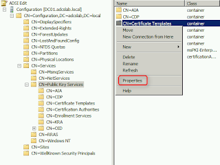 7. On central pane, right-click “CN=Certificate Templates“, select “Properties“.