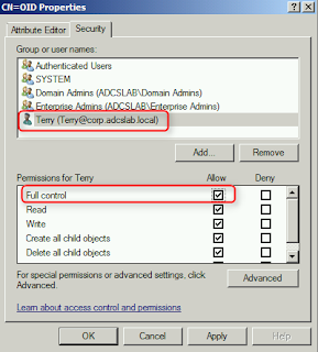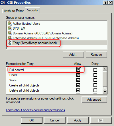 Remark: In production environment, we should grant the permissions to a global or universal group that contains users for “Certificate Templates” and “OID“.