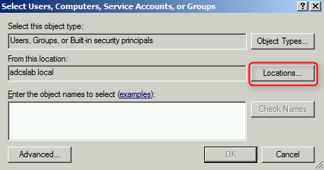 10. On “Select Users, Computers, or Groups” window, click “Locations“.