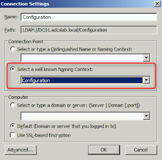 4. On “Connection Settings” window, next to “Select a well known Naming Context“, select “Configuration“.