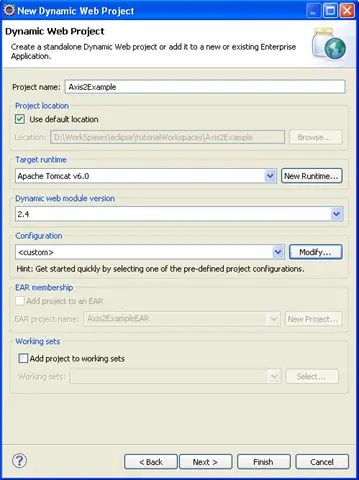 Give the project Name as Axis2Example . Set Apache tomcat as Runtime Server