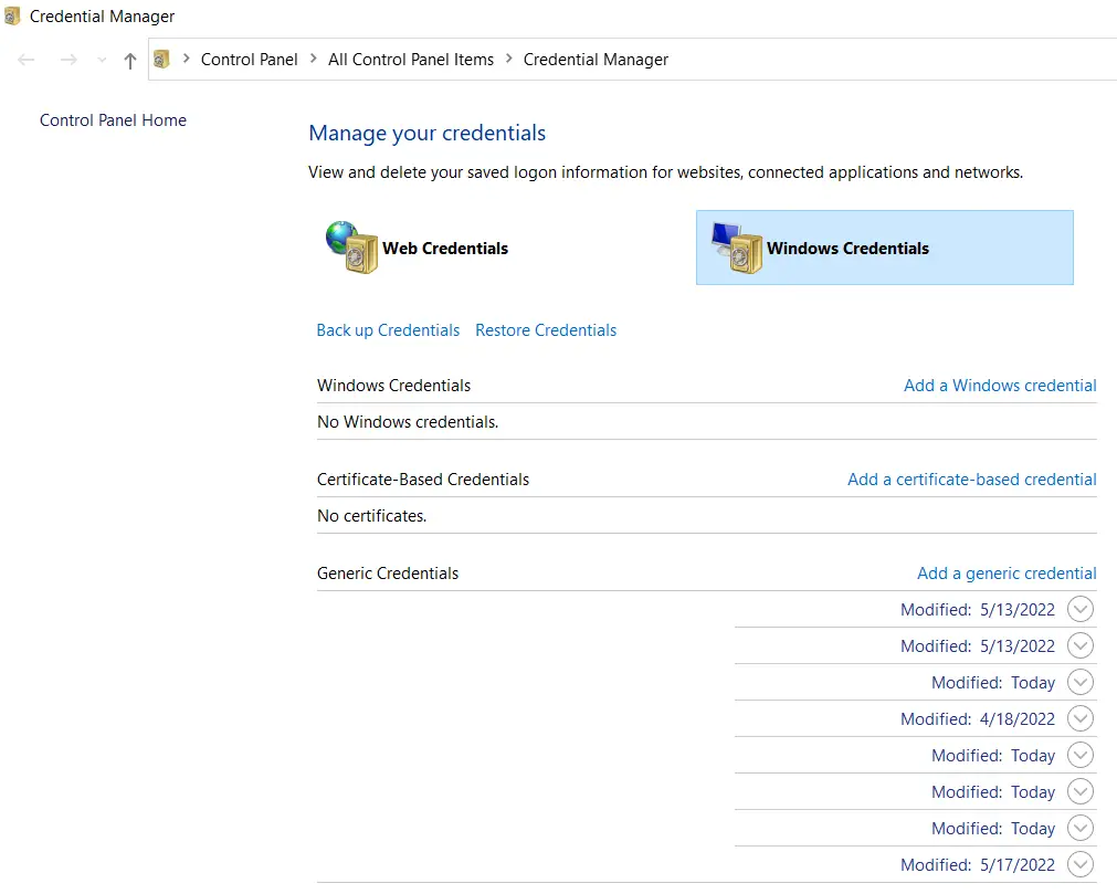 Alternate way to go to credentials manager in windows 10: Go to Start menu and type credentials manager.